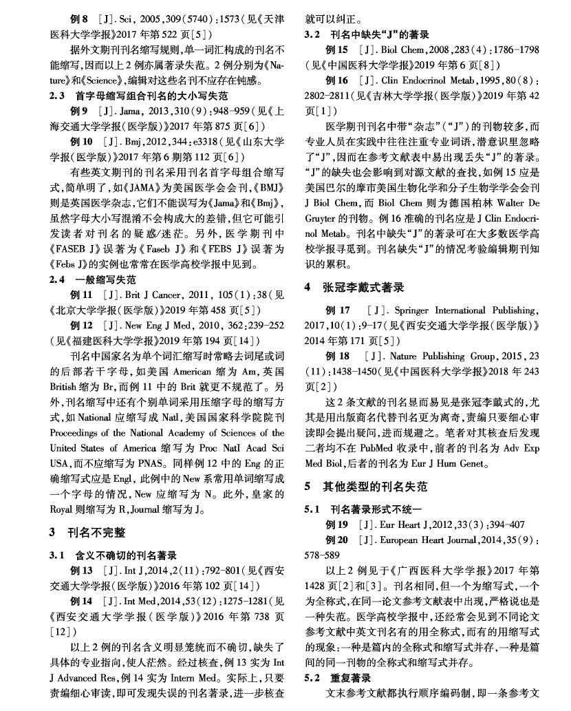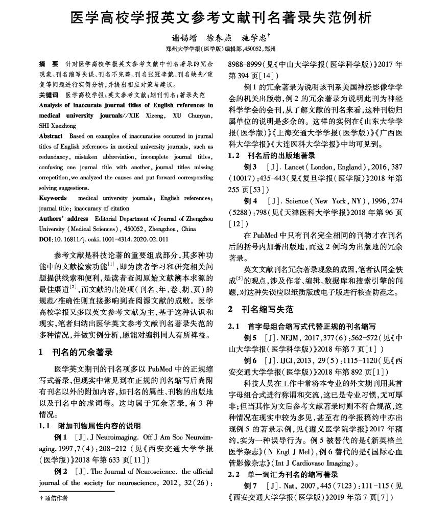 引用本文:谢锡增,徐春燕,施学忠.医学高校学报英文参考文献刊名著录失范例析[J].编辑学报,2020,32(2):166-168.